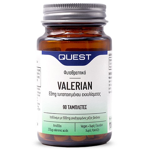 Το συμπλήρωμα διατροφής Valerian της Quest περιέχει εκχύλισμα από τη ρίζα του φυτού βαλεριάνα (Valeriana officinalis), το οποίο χρησιμοποιείται παραδοσιακά στην Ευρώπη.