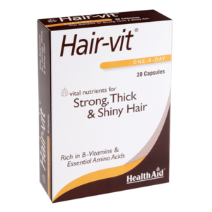 Το Hair-Vit της HealthAid είναι ένα ισορροπημένο συμπλήρωμα με βιταμίνες κυρίως του συμπλέγματος Β, ιχνοστοιχεία, μέταλλα και αμινοξέα που χρειάζονται τα μαλλιά για να διατηρήσουν την υφή και την πυκνότητά τους.