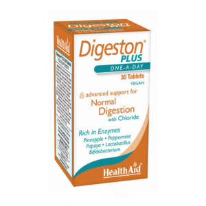 Digeston® Plus tablets with vegan enzymes, fruit extracts, friendly bacteria and chloride, all in one-a-day tablet offer you digestive comfort and intestinal balance!