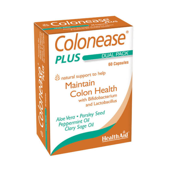Το Colonease Plus της HealthAid είναι ένας διπλός συνδυασμός από κάψουλες με Αλόη Βέρα και έλαια μέντας, μαϊντανού και φασκόμηλου και κάψουλες με προβιοτικές καλλιέργειες στελεχών Lactobacillus & Bifidobacterium (4 billion) για φυσιολογική πεπτική λειτουργία και διατήρηση της ισορροπίας της εντερικής χλωρίδας.