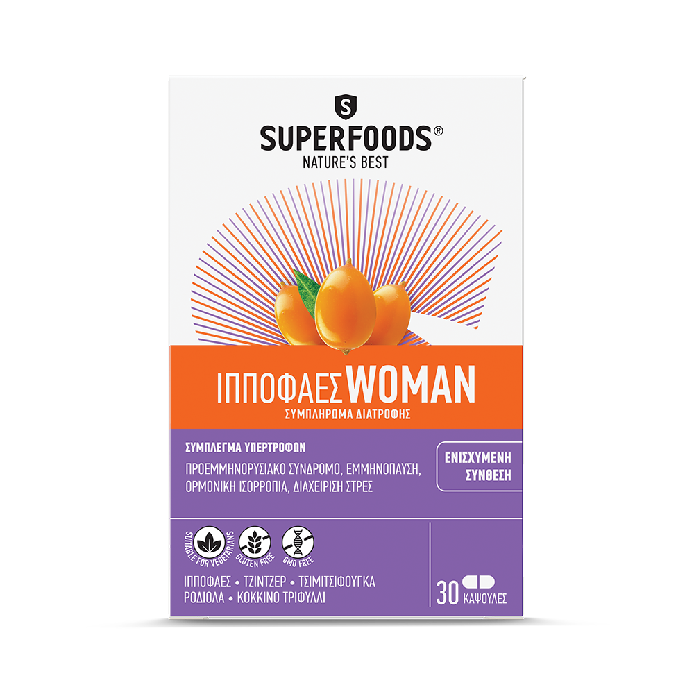 To SUPERFOODS ΙΠΠΟΦΑΕΣ WOMAN είναι κατάλληλο για ανάγκες της γυναίκας. Περιέχει ένα μοναδικό συνδυασμό από Ιπποφαές, Τζίντζερ, Τσιμιτσιφούγκα, Ροδιόλα, Κόκκινο Τριφύλλι, Ρεσβερατρόλη, Μαγνήσιο και Βιταμίνες Α, D, E που συμβάλουν στην προστασία των κυττάρων από το οξειδωτικό στρες, τη φυσιολογική λειτουργία του ανοσοποιητικού, τη διατήρηση υγιών οστών, δοντιών και το φυσιολογικό μεταβολισμό του σιδήρου.